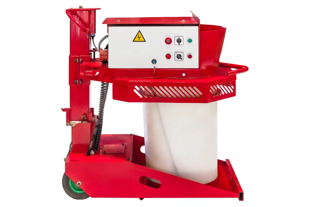 Миксер с электроприводом для производства резиновых покрытий. Перемешивает резиновую крошку, полиуретановое связующее и пигменты в однородную массу за 5 минут. Максимально допустимая разовая загрузка — 90 кг.